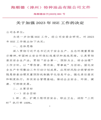 海順德(漳州)特種油品有限公司為進(jìn)一步落實(shí)企業(yè)安全生產(chǎn)主體責(zé)任,強(qiáng)化公司安全、環(huán)保、健康管理工作,開年之初便下發(fā)了公司一號(hào)文——《關(guān)于加強(qiáng)2023年HSE工作的決定》。明確公司2023年度安全目標(biāo)和環(huán)保目標(biāo)。目標(biāo)明確要求安全方面要實(shí)現(xiàn)公司全年報(bào)車間(部門)級(jí)以上事故為零,不發(fā)生被政府部門處罰的重大隱患和事件,企業(yè)主要負(fù)責(zé)人、安全管理人員安全能力考核合格率100%,特殊工種從業(yè)人員持證上崗率100%,八大特殊作業(yè)JSA分析率100%,承包商、危險(xiǎn)化學(xué)品車輛安全相關(guān)資質(zhì)合格率100%等重要目標(biāo)。環(huán)保方面要求做到不發(fā)生被政府部門處罰的環(huán)境問題和污染事件,排污許可執(zhí)行率100%,污水外送合格率100%,環(huán)境監(jiān)測計(jì)劃執(zhí)行率100%等具體指標(biāo)。