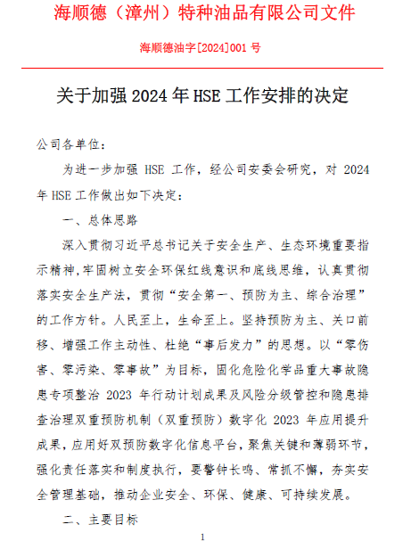 為認(rèn)真落實(shí)習(xí)近平總書記關(guān)于做好安全工作的指示、批示精神,筑牢安全防線。公司安全生產(chǎn)委員會(huì)于2023年12月20日組織召開了做好2024年HSE工作的討論會(huì),旨在對(duì)公司2024年的HSE工作進(jìn)行頂層設(shè)計(jì),避免安全工作的隨機(jī)化和碎片化管理。對(duì)討論會(huì)上提出的意見或建議進(jìn)行完善或修改后,2024年元月2日下發(fā)了海順德(漳州)特種油品公司《關(guān)于加強(qiáng)2024年HSE工作安排的決定》。決定明確了公司全年的HSE目標(biāo)及落實(shí)企業(yè)安全生產(chǎn)主體責(zé)任、強(qiáng)化直接作業(yè)環(huán)節(jié)安全管理、事故責(zé)任追究等15項(xiàng)主要工作。